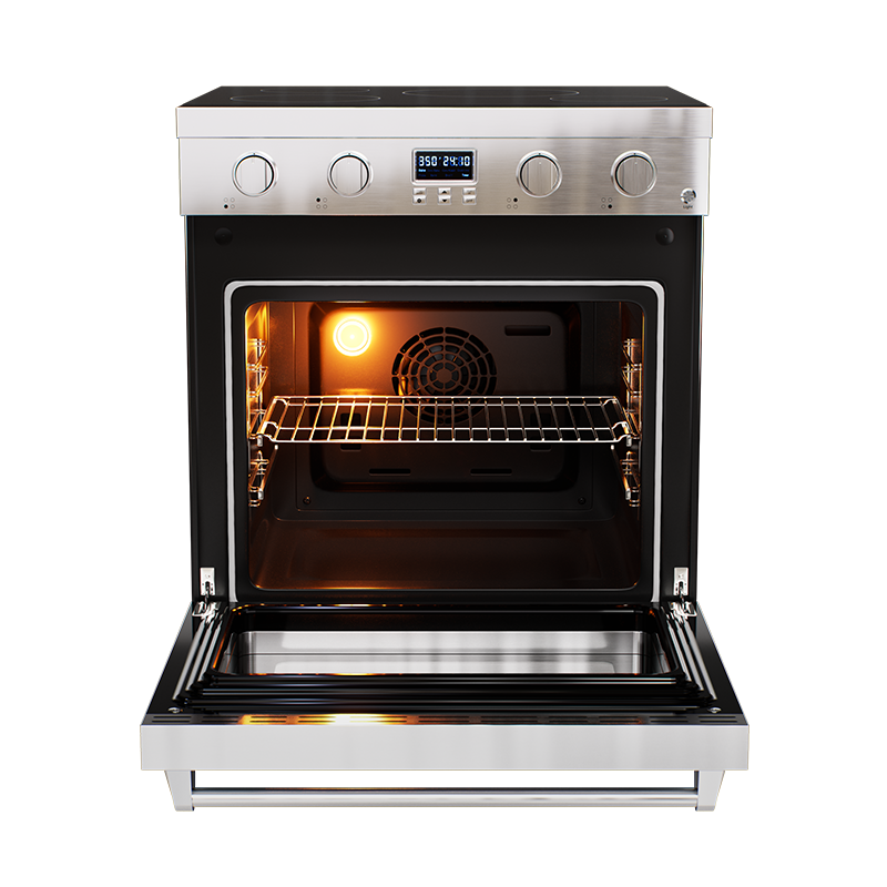 Electra’s convection oven bakes evenly from 250°F to 550°F with a dedicated convection heating element around the fan for faster, more consistent results (true convection). It preheats to 450°F in just 10 minutes and—unlike gas—keeps heat inside the oven, not your kitchen.